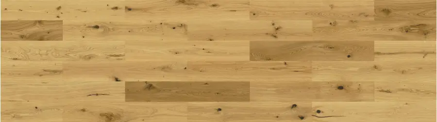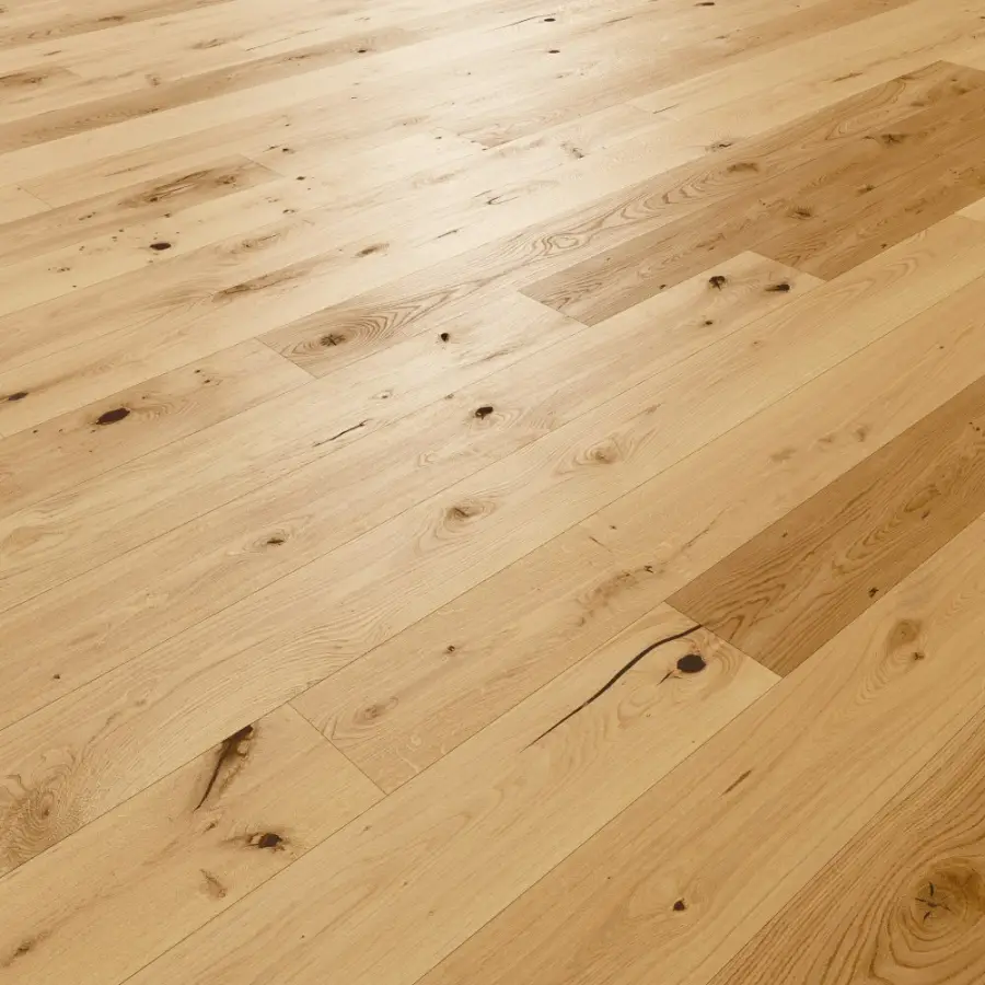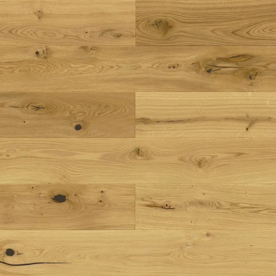 Drewno dębowe o barwie żółtobrązowej z charakterystycznymi dla gatunku naturalnymi cechami. Podłoga odznacza się dużą zmiennością usłojenia i mocno zróżnicowaną kolorystyką.Ciemnieje pod wpływem promieni UV.Warstwa wierzchnia z czterostronną fazą,strukturyzowana przez szczotkowanie.