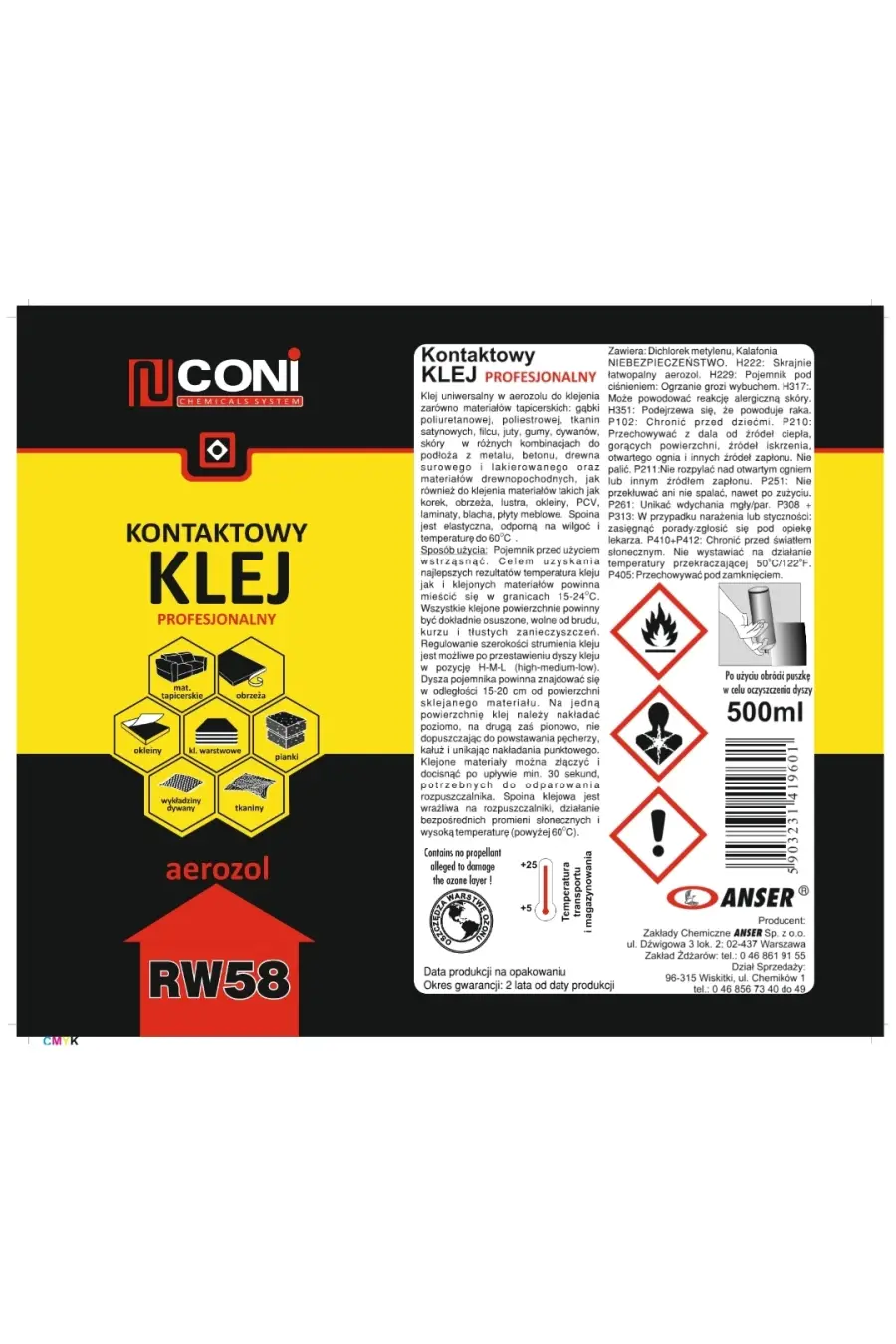 Klej uniwersalny w aerozolu na bazie kauczuku syntetycznego, żywic syntetycznych i środków modyfikujących w rozpuszczalnikach organicznych.