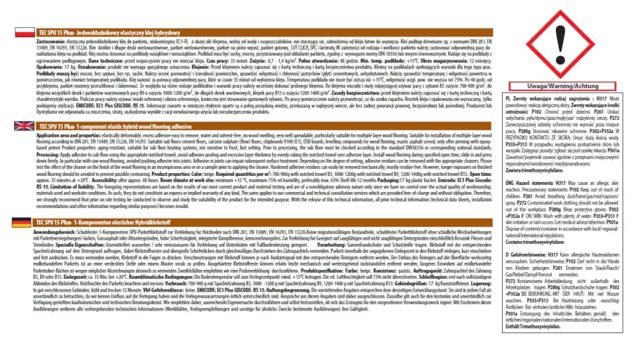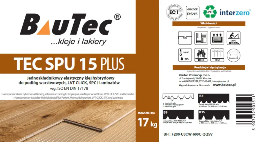 Klej poliuretanowy bez zawartości silikonu zapewniający elastyczność i wysoką wytrzymałość na zerwanie. Do klejenia desek wielowarstwowych (w tym 2- i 3-warstwowych) i parkietu wielowarstwowego oraz krótkiego litego parkietu na pióro wpust o długości do 30 cm. Minimalna temperatura podłogi przy klejeniu to +15°C i maksymalna wilgotnośćwzględna powietrza w pomieszczeniu 75%. Klejem można kleić deski wielowarstwowe do długości 2,5 m i szerokości 25 cm. Paca B15.