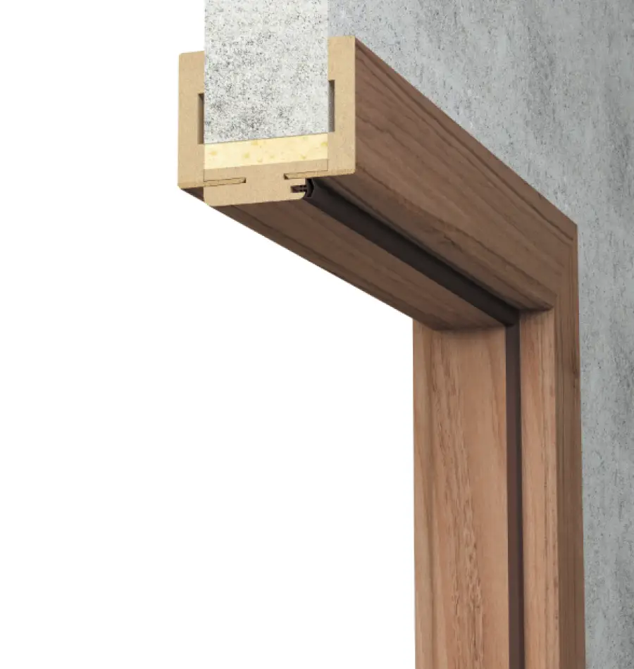 Ościeżnica odpowiednia do skrzydeł Verso oraz Estra Ościeżnica regulowana z kątownikiem T80 wyposażona jest w kątowniki z małymi promieniami zaokrąglenia profilu poprzecznego. Wykonana jest z wysokogatunkowej płyty drewnopochodnej. Od strony ekspozycyjnej pokryta jest w całości z drewnopodobną folią dekoracyjną DRE-Cell Decor.