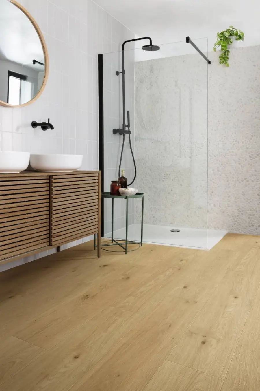 Powierzchnia w 100% szczelna i plamoodporna – brud i płyny nie wnikają w strukturę, co ułatwia codzienne utrzymanie podłogi w czystości.