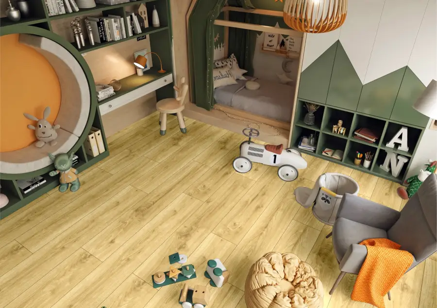 Panele w dekorze Dąb Wielkopolski cechują się naturalnym, ciepłym odcieniem drewna dębowego, który nadaje wnętrzom elegancji i przytulności. Dzięki 4-stronnej V-fudze, czyli delikatnym rowkom frezowanym na krawędziach każdej deski, podłoga wygląda jak autentyczna podłoga z litego drewna z wyraźnym podziałem szczelin między deskami. Ten zabieg optycznie poprawia głębię i strukturę podłogi, a jednocześnie podkreśla klasyczny styl przestrzeni i sprawia, że całe pomieszczenie wygląda bardziej naturalnie i luksusowo.