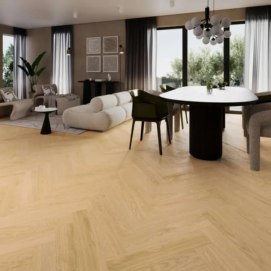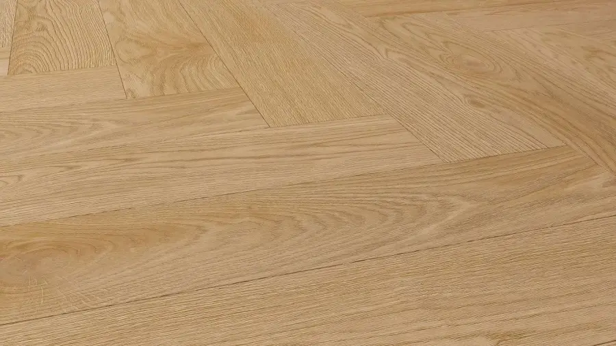 Realistyczna struktura i precyzyjne odwzorowanie kolorów sprawiają, że podłoga wygląda jak prawdziwe drewno, zachowując charakterystyczny efekt klasycznej jodełki.