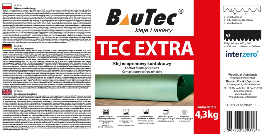 Klej neoprenowy służy do klejenia tworzywa PCV, CV, gumy, metalu i drewna, sztucznej trawy, skóry, korka, pianki, nosków schodowych, cokołów/listew przypodłogowych. TEC EXTRA ma wysoką końcową siłę klejenia. Nadaje się na zewnątrz i wewnątrz, na jastrychy cementowe i anhydrytowe, magnezjowe, płyty wiórowe V100, płyty OSB, deski z litego drewna,masy samopoziomujące, schody i ściany betonowe, posadzki kamienne, płytki ceramiczne. Minimalna temperatura podłogi przy klejeniu to +15*C i maksymalna wilgotnośćpowietrza w pomieszczeniu 65%. W przypadku podłoży nierównych i porowatychzalecamypodłoże wyrównać masą samopoziomującą. W przypadku klejenia wykładziny do równego i gładkiego podłoża cementowego podłoże należy zagruntować gruntem zalecanym przez Bautec, np. TEC PRIMER D. Przy gruntowaniu unikać tworzenia się kałuż i grubszych warstw.