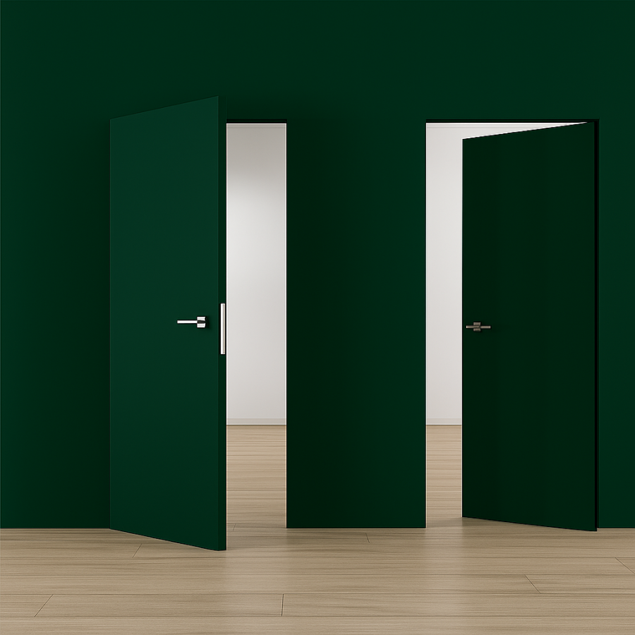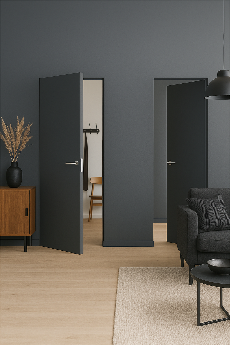 W komplecie surowe skrzydło drzwiowe do malowania. Drzwi ukryte w ścianie to skrzydła zamontowane w taki sposób, że ich krawędzie są na równo z powierzchnią ściany, co sprawia, że wyglądają jak jej część. Są one często stosowane w nowoczesnym wzornictwie, gdzie chodzi o uzyskanie płynnego, spójnego wyglądu wnętrza. Nie ma widocznych okuć ani ramek, więc muszą być one zamontowane płynnie oraz na równi z powierzchnią ściany.