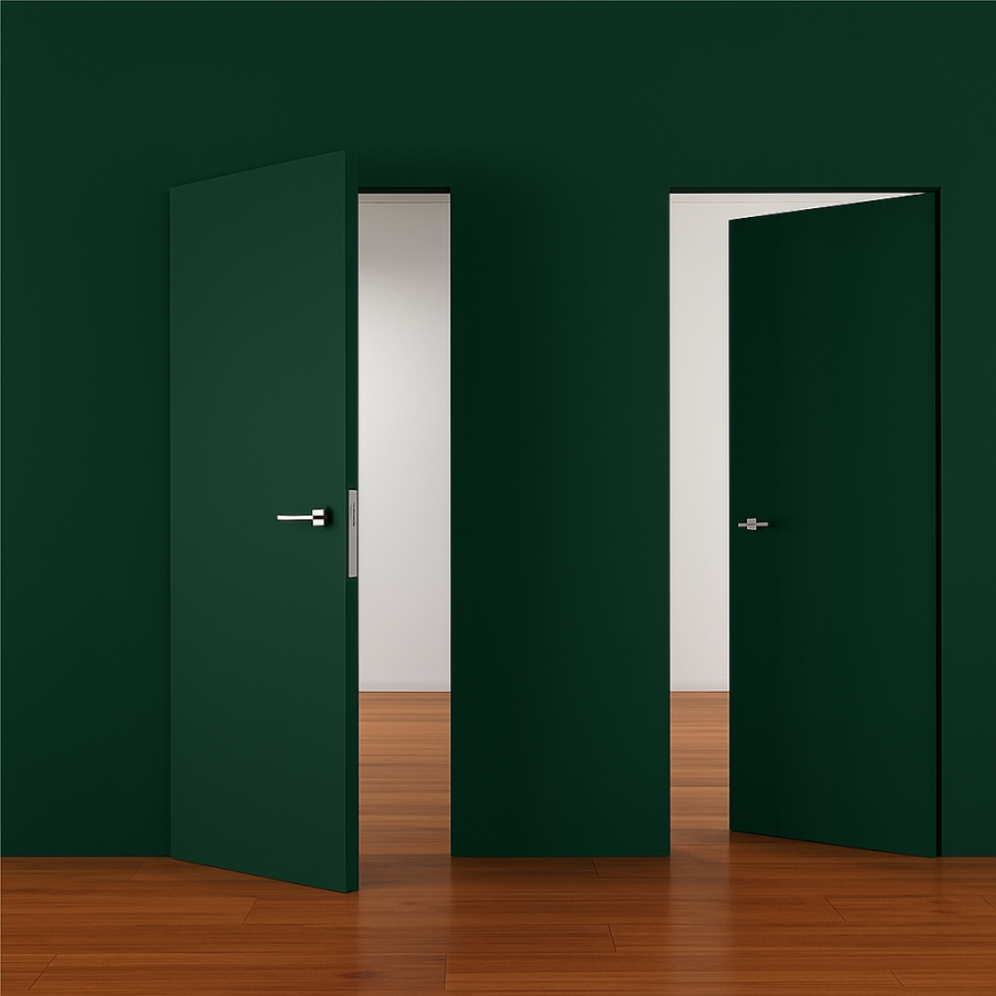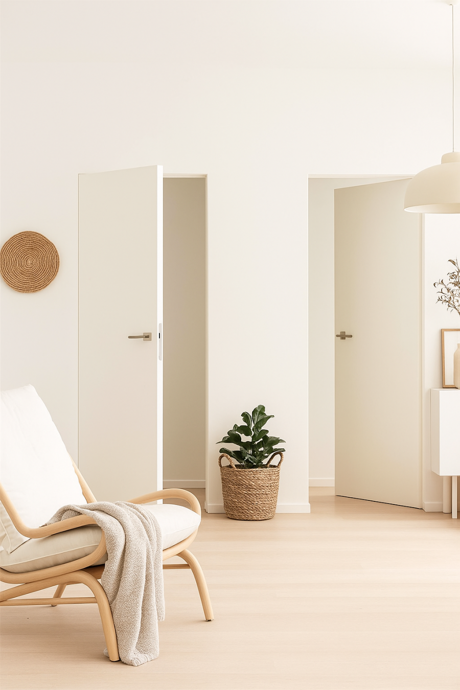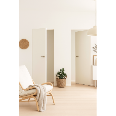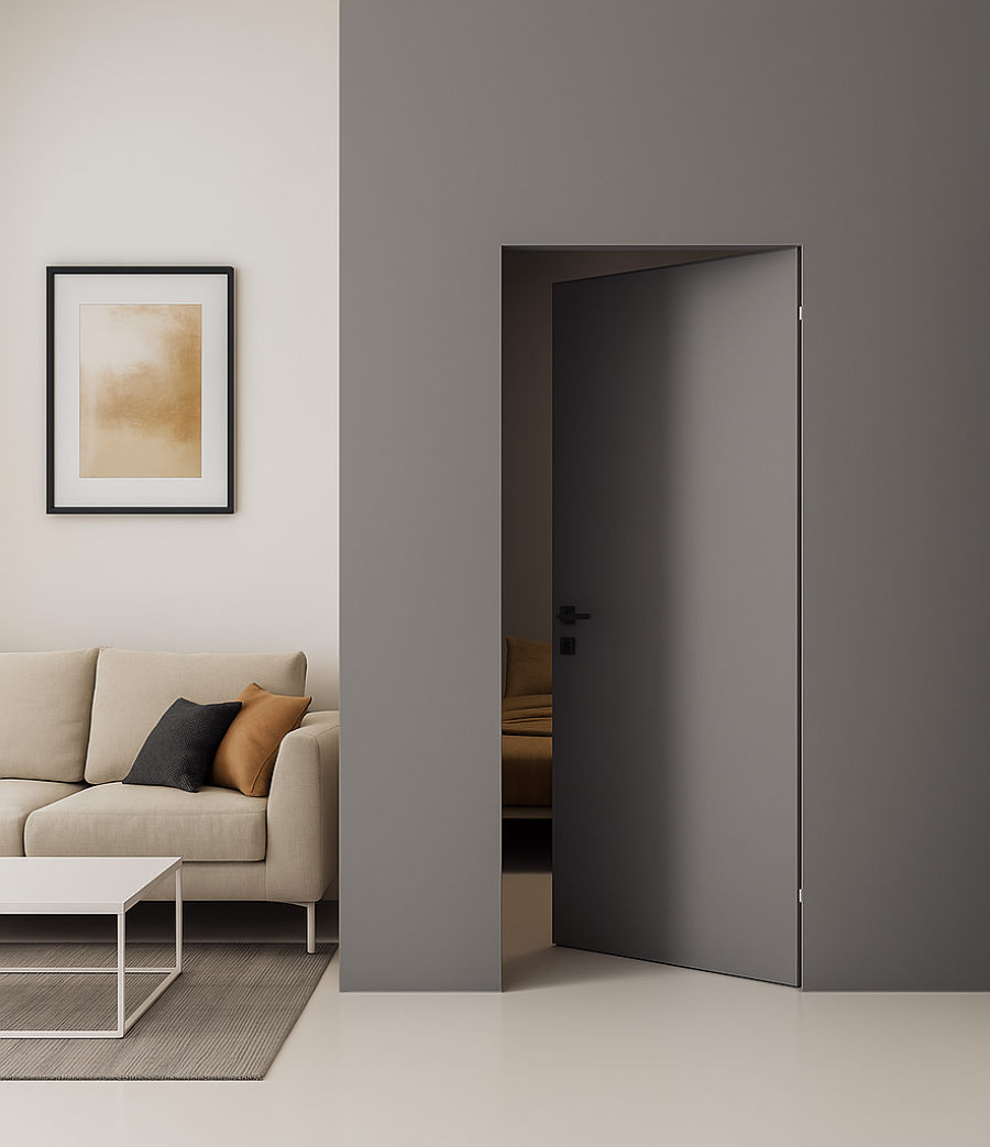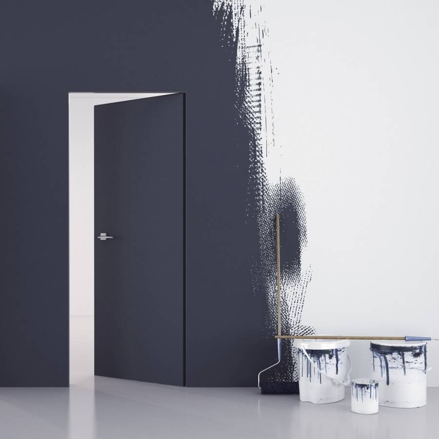 W komplecie surowe skrzydło drzwiowe do malowania. Drzwi ukryte w ścianie to skrzydła zamontowane w taki sposób, że ich krawędzie są na równo z powierzchnią ściany, co sprawia, że wyglądają jak jej część. Są one często stosowane w nowoczesnym wzornictwie, gdzie chodzi o uzyskanie płynnego, spójnego wyglądu wnętrza. Nie ma widocznych okuć ani ramek, więc muszą być one zamontowane płynnie oraz na równi z powierzchnią ściany.